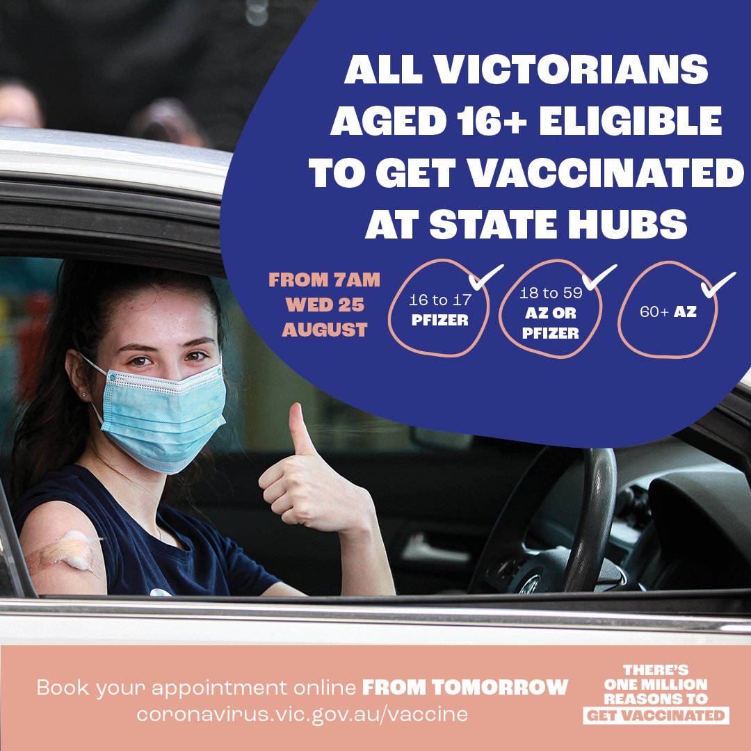 But from Thursday onwards Victoria needed to book the specific vaccine they want to receive. From Wednesday Pfizer eligibility expands to people aged 16 to 39 across Victorias 55 vaccination hubs as supply ramps up courtesy of 175000 doses imported from Poland. Our goal is to provide a welcoming and culturally safe environment at COVID-19 vaccine clinics.
